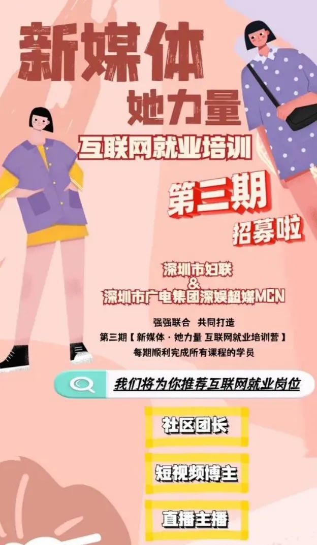活動簡介:“新媒體·她力量”全職媽媽及困境女性互聯網就業培訓項目,由深圳市婦女聯合會主辦,深視娛樂傳媒(深圳)有限公司承辦,主要服務內容包括:社區團長就業培訓、孵化新媒體賬號&直播培訓。