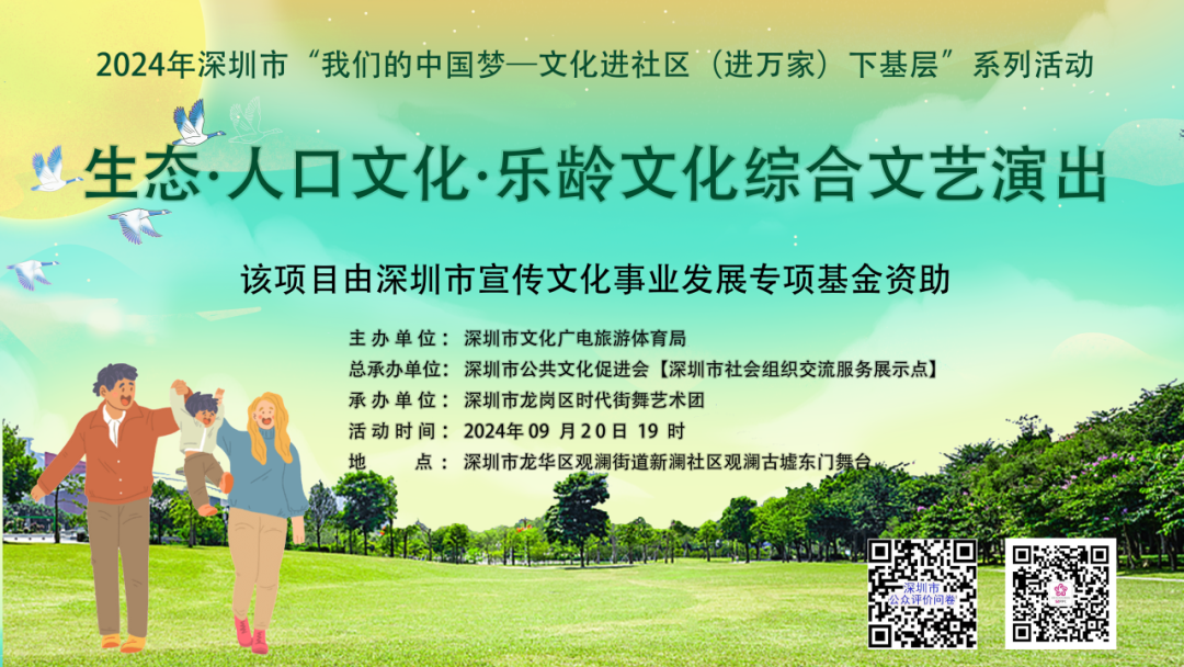 活動簡介:為建設普惠性、高質量、可持續的城市公共文化服務體系,深入推進全民藝術普及工作,豐富市民文化生活,提升市民文化藝術素養,涵養城市人文精神、藝術精神、科學精神,鼓勵社會力量參與公益文化建設,2024年深圳市“我們的中國夢—文化進社區(進萬家)下基層”系列活動,將于9月20日在龍華區觀瀾街道新瀾社區觀瀾古墟東門舞臺,舉行生態·人口文化·樂齡文化綜合文藝演出。